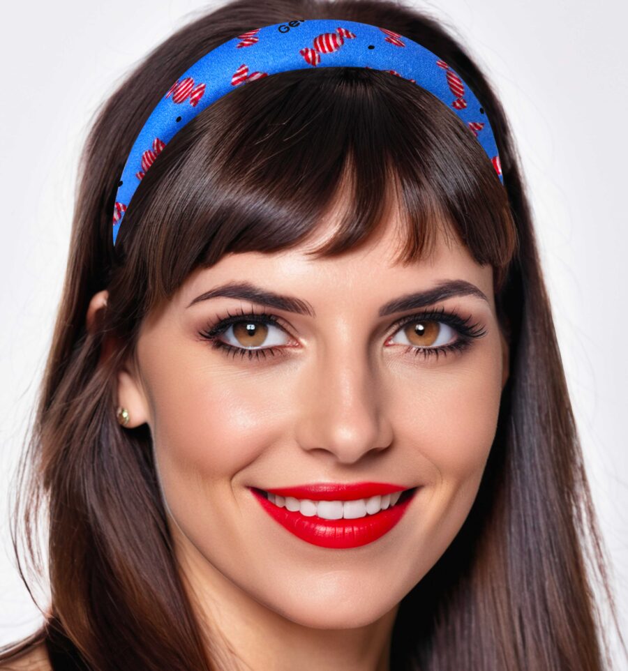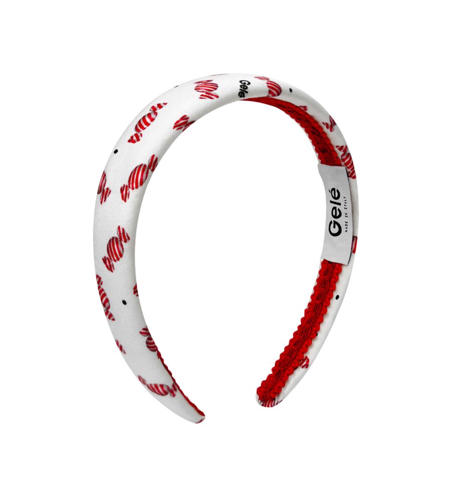 The customised “candy print”, created by the designer, is distinctive of the Gelé world, and combines small red and white striped candies scattered on a pattern of black polka dots with a light blue/white background.
